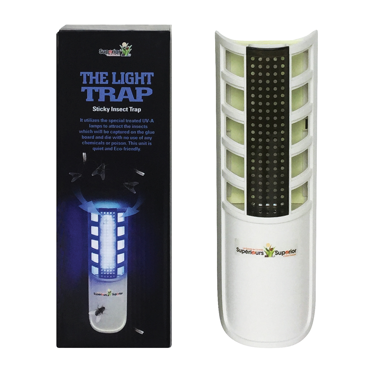 Light attracts flies, mosquitoes and other insects on sticky trap.