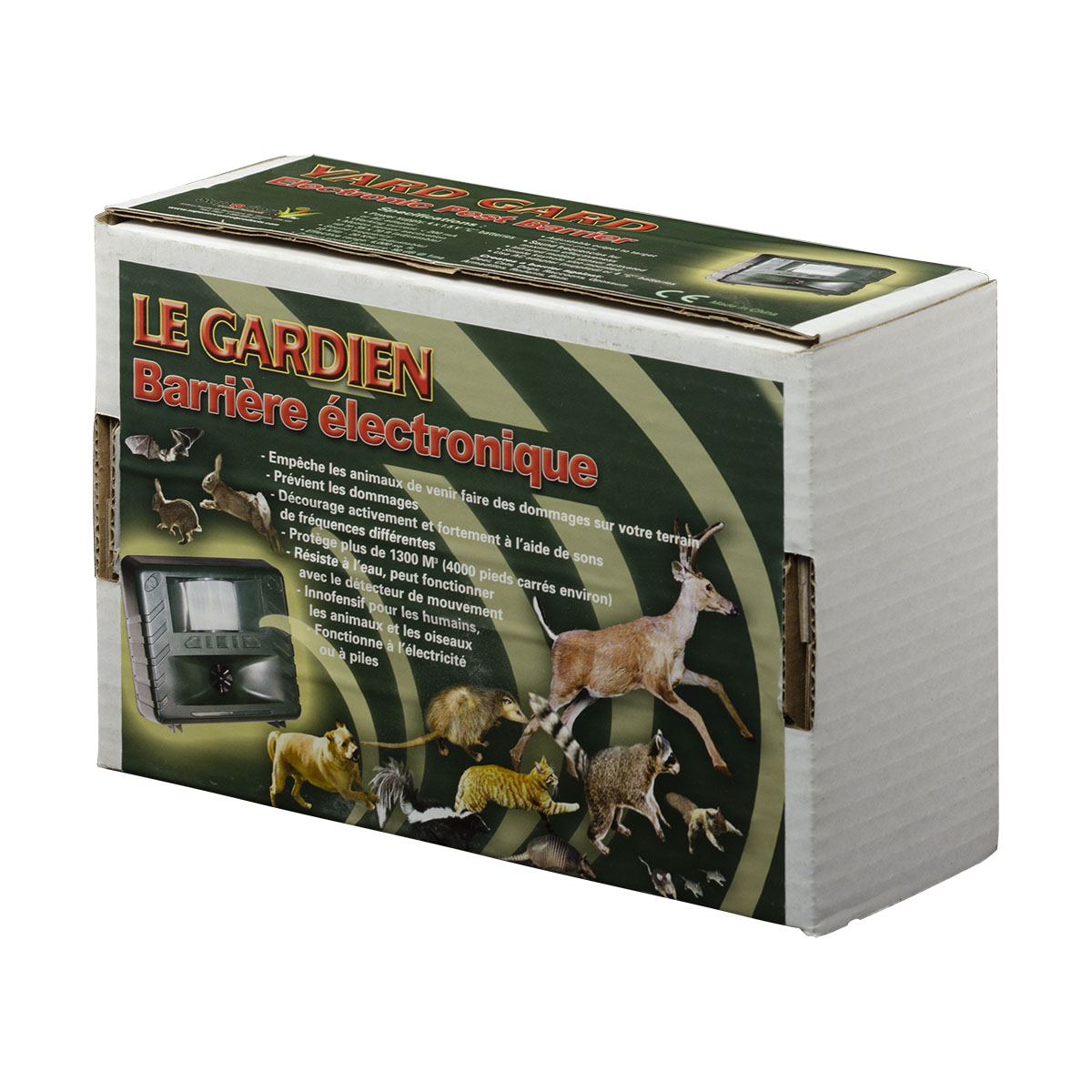 Barrière sonore à fréquences (15 à 25 kHz). Empêche les animaux de venir faire des dommages sur votre terrain.